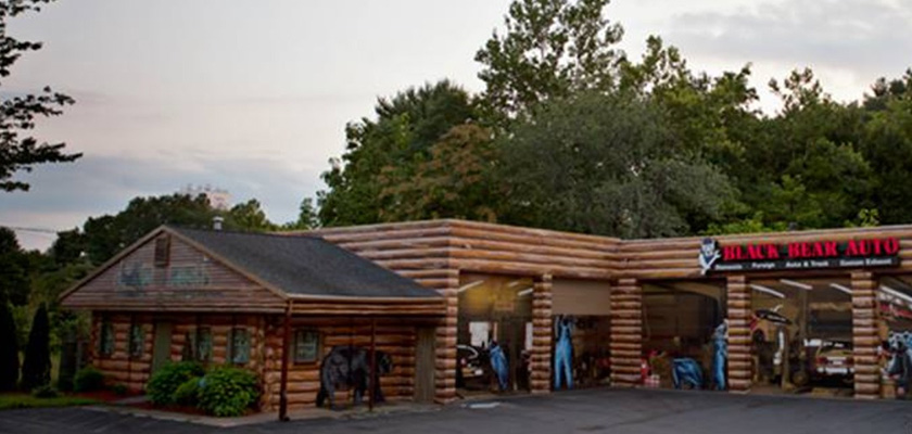 Black Bear Auto in Bristol, Connecticut doesn’t look like any auto repair shop you’ve ever seen before. The entire building is painted to look like a log cabin and the bay doors are painted with scenes of huge black bears inside the shop, in overalls, working on cars.